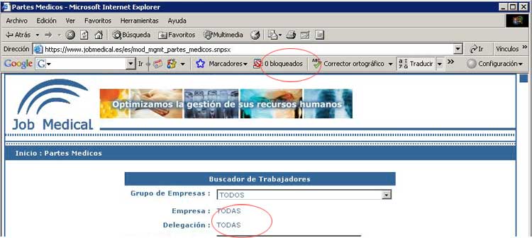 Para permitir las ventanas emergentes en www.jobmedical.es, estando dentro de la aplicación habrá que picar en el botón:' 0 bloqueados', quedando de la siguiente manera: